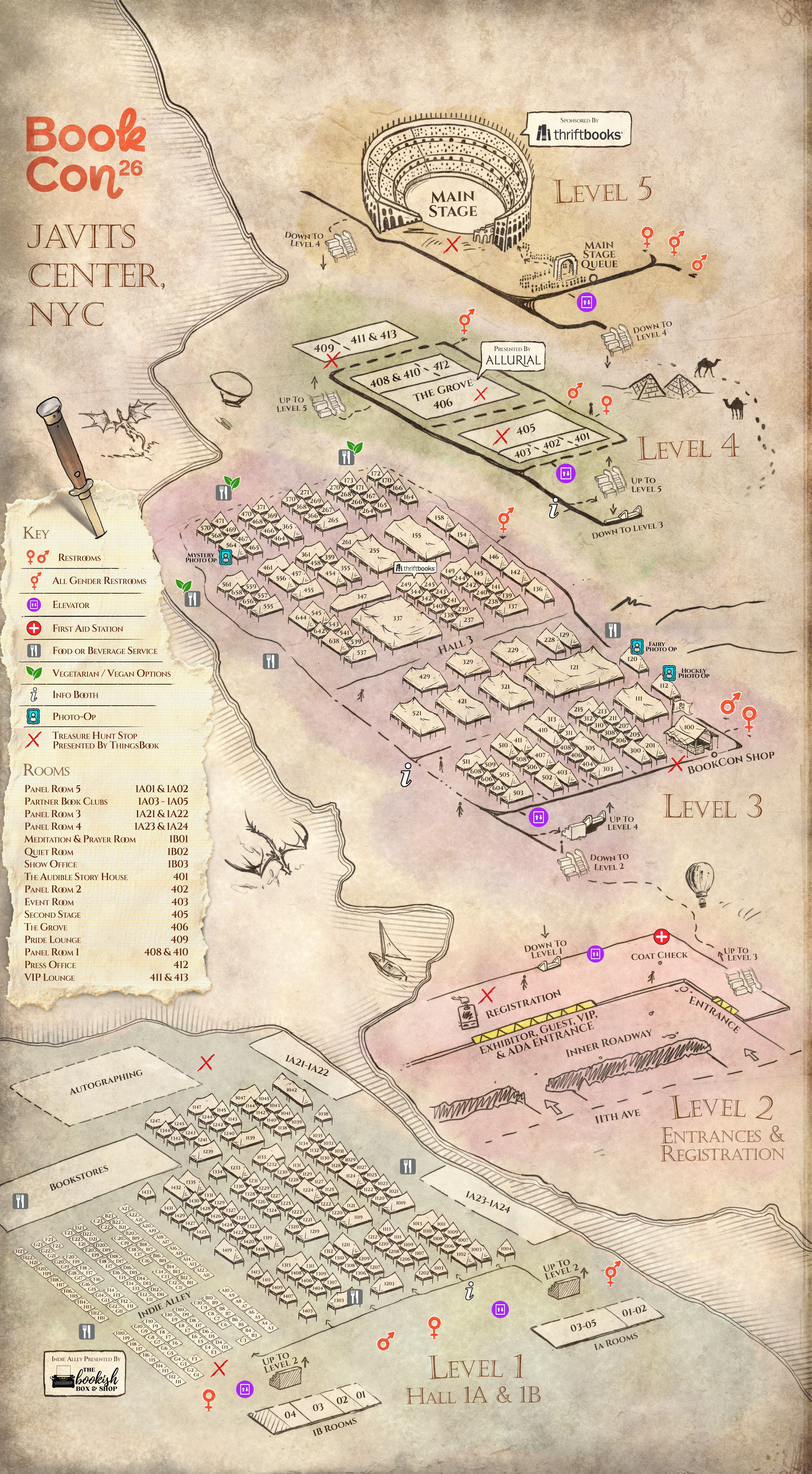 Whether you’re on a quest to explore or are just trying to find the nearest restroom, use these maps to help you navigate the world of BookCon. With one version inspired by the epic fantasy maps of some of our favorite books and another one that keeps things simple, use whichever version works best for you!